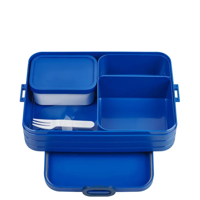 Met de Mepal TAB Bento Lunch Box neem je makkelijk je lunch mee naar werk, school of een dagje uit. De box bestaat uit twee aparte vakken en een extra box met vorkje. Door de praktische indeling kun jij je eten makkelijk gescheiden van elkaar meenemen, en maak je van je lunch een feestje. Deze Large lunch box heeft een inhoud van 1,5 liter. De bentobakjes mogen (zonder deksel) in de magnetron. Om het nog makkelijker te maken is deze Mepal Bento lunch box vaatwasser bestendig.