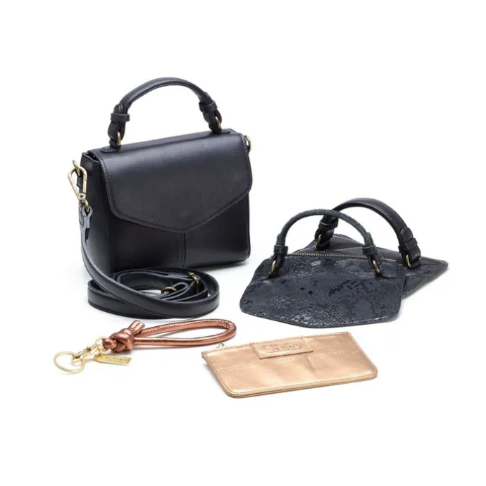 Ben of ken jij iemand die graag van look wisselt, maar het zonde vindt om steeds een nieuwe tas te kopen? Dan is deze giftbox van Chabo dé oplossing! Deze giftbox bevat namelijk niet alleen een etui en een sleutelhouder, maar ook drie tassen in één. Hoe dit precies werkt? De klep van de handtas is verwisselbaar, door middel van een rits. Haal de oude klep er af en vervang deze voor één van de bijgeleverde kleppen en voilà : je tas heeft een compleet ander uiterlijk!