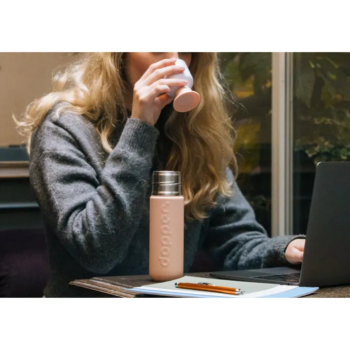 Deze herbruikbare, duurzame fles is de Dopper Insulated Drinkfles. De waterfles houdt je warme en koude drankjes op temperatuur. De missie van Dopper is een betere wereld met minder plasticvervuiling. Door het kopen van deze waterfles draag jij jouw steentje hier aan bij. De drinkfles is herbruikbaar en hierdoor de perfecte vervanging voor wegwerp drinkflesjes. Het design van de fles is praktisch en stijlvol. Je kan de onderdelen gemakkelijk van elkaar halen waardoor de waterfles gemakkelijk is schoon te maken.