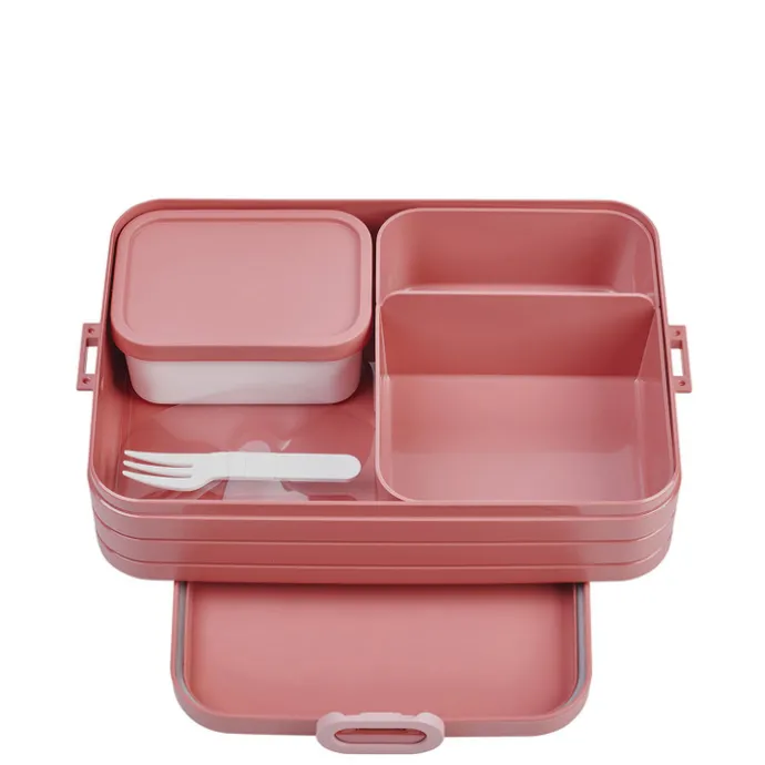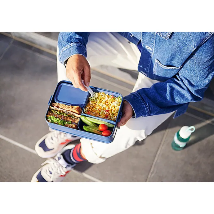 Met de Mepal TAB Bento Lunch Box neem je makkelijk je lunch mee naar werk, school of een dagje uit. De box bestaat uit twee aparte vakken en een extra box met vorkje. Door de praktische indeling kun jij je eten makkelijk gescheiden van elkaar meenemen, en maak je van je lunch een feestje. Deze Large lunch box heeft een inhoud van 1,5 liter. De bentobakjes mogen (zonder deksel) in de magnetron. Om het nog makkelijker te maken is deze Mepal Bento lunch box vaatwasser bestendig.